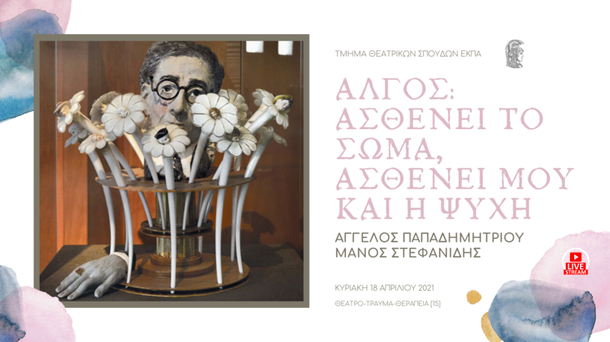 Στη δέκατη πέμπτη ψηφιακή συνομιλία της δράσης «Θέατρο-Τραύμα-Θεραπεία» ο καλλιτέχνης Άγγελος Παπαδημητρίου συζητάει με τον ιστορικό-κριτικό τέχνης και πανεπιστημιακό Μάνο Στεφανίδη για την έννοια του άλγους στη σύγχρονη τέχνη, τα εικαστικά και το θέατρο, για την επιθυμία και την τιμωρία της, για το πένθος που κρύβει κάθε έρωτας και για το υποδόριο χιούμορ που εμφιλοχωρεί πίσω από κάθε δράμα. Η συνομιλία θα πλαισιωθεί με αποσπάσματα από τις παραστάσεις του Νίκου Καραθάνου «Γκόλφω» και «Δεκαήμερο» και με την πείρα που έχουμε αποκομίσει από την τρέχουσα εμπειρία του εγκλεισμού.